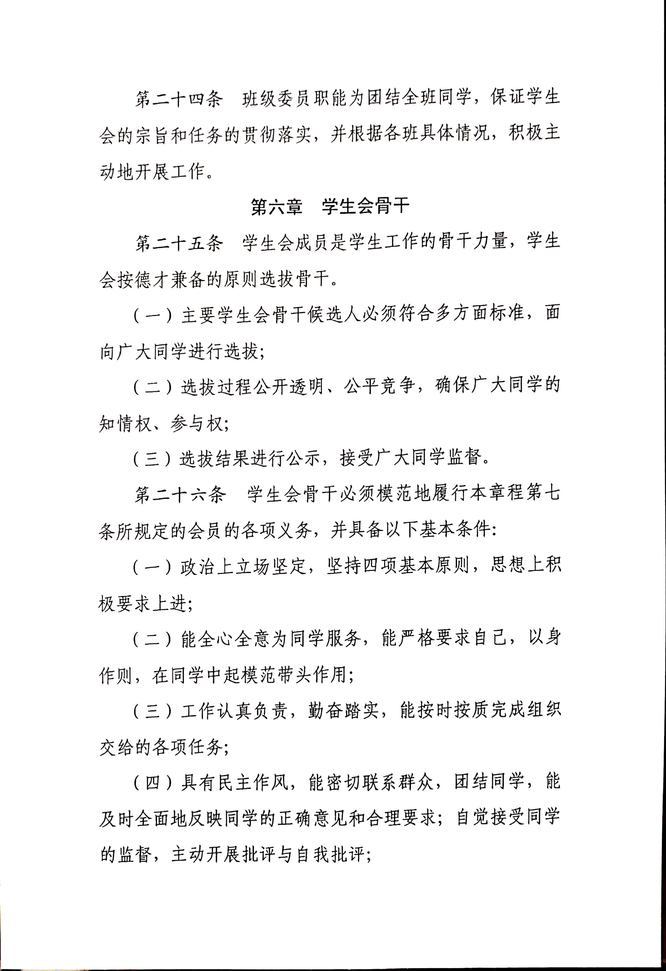(五)纪律作风。主要考察学生骨干在生活作风、言行举止、团结同学、舆论影响等方面的综合表现,要求做到公道正派、弘扬正气、关系融洽,共同营造风清气正的学生会工作氛围。