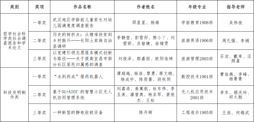 第十七届“挑战杯”全国大学生课外学术科技作品竞赛武汉城市职业学院选拔赛决赛已结束,竞赛组委会组织专家,从项目科学性、创新性、先进性、前沿性、可行性及现实意义、应用前景等方面对参赛项目进行了认真评审,评选出哲学社会科学类社会调查报告和学术论文、科技发明制作各一、二、三等奖,现予以公示。公示期为2021年4月6日至10日。公示期内,如有异议,请通过实名方式反馈至学校“挑战杯”竞赛组委会办公室,并提供必要的证明材料,以便核实验证。